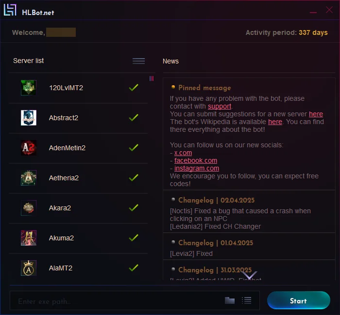 - After selecting the Metin startup file, click START and the game will launch with the bot