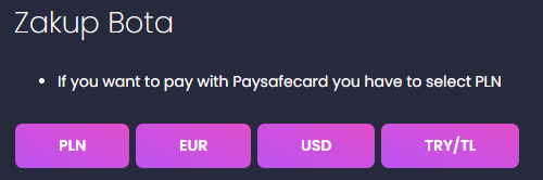 Jeżeli chcesz dokonać zakupu z użyciem PaySafeCard to MUSISZ wybrać walutę PLN, tylko ta waluta posiada taką metodę płatności, jednak kod PSC może być w rożnych walutach - system automatycznie przewalutuje płatność.